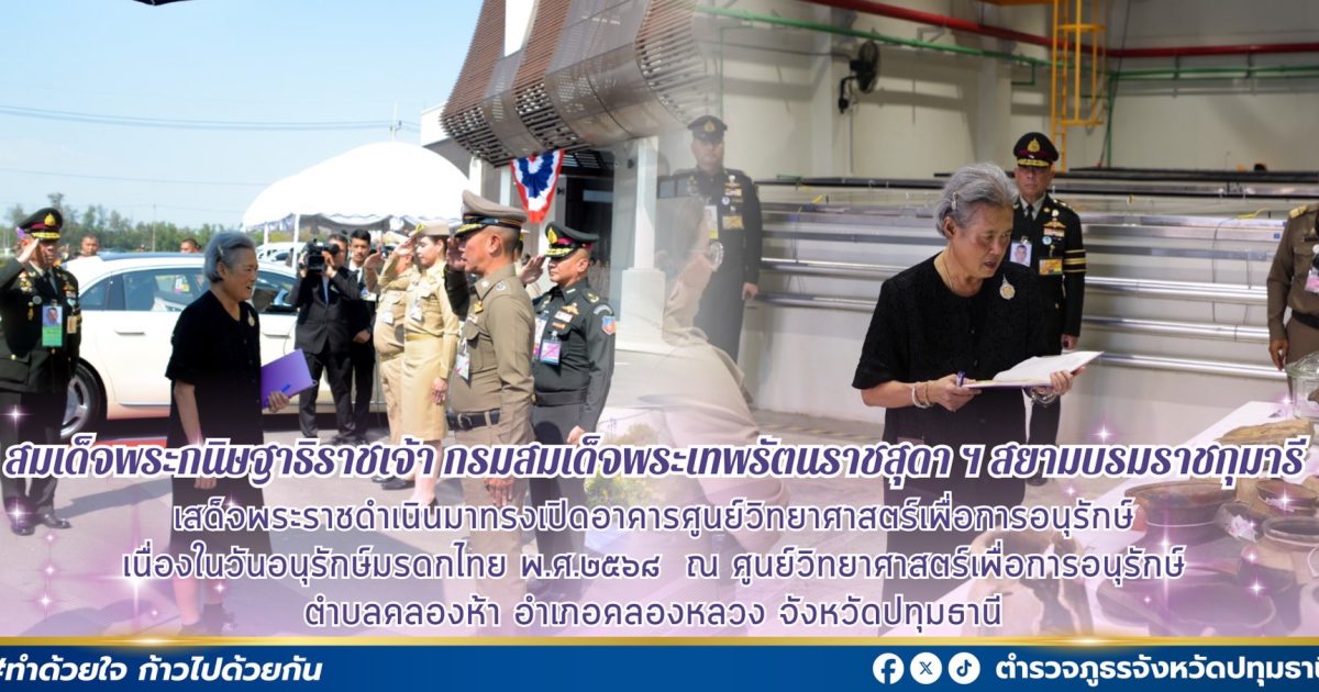 วันนี้ (2 ก.พ. 2569) เวลา 14.30 น. สมเด็จพระกนิษฐาธิราชเจ้า กรมสมเด็จพระเทพรัตนราชสุดาฯ สยามบรมราชกุมารี เสด็จพระราชดำเนินไปทรงเปิด อาคารศูนย์วิทยาศาสตร์เพื่อการอนุรักษ์ ณ อำเภอคลองหลวง จังหวัดปทุมธานี เนื่องในวันอนุรักษ์มรดกไทย พ.ศ.2568